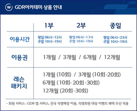 GDR 아카데미는 회원제 방식으로 운영되며, 지점마다 약간의 차이는 있지만 전반적으로 아래와 같은 요금제가 적용됩니다: