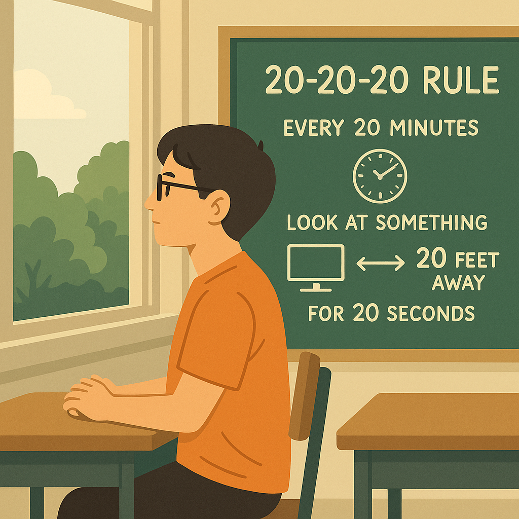20-20-20 규칙은 20분마다, 20피트(약 6미터) 떨어진 곳을, 20초 동안 바라보는 것을 의미합니다. 집중된 상태에서 오랫동안 가까운 거리만 바라볼 경우, 눈의 조절 근육이 경직되기 쉬운데, 이 규칙은 이를 이완시키는 데 효과적입니다. - 실천 방법