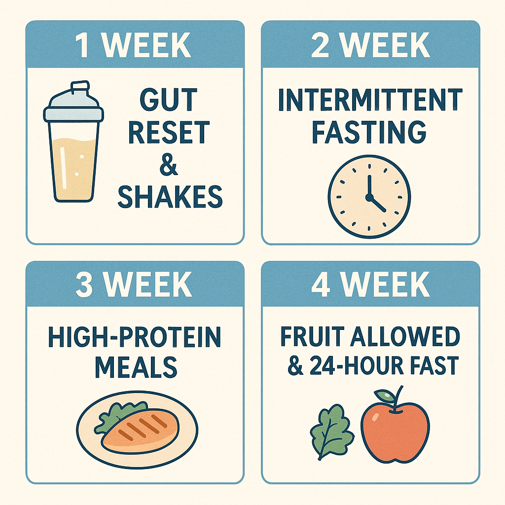 소비자가 이 다이어트를 검색했을 때 가장 궁금해할 포인트는 바로 "실제로 어떻게 진행되는가", "무엇을 먹어야 하는가", "단식은 어떻게 해야 하는가"입니다. 따라서 주차별 핵심 변화와 전략을 명확히 전달하는 데 중점을 두었습니다.